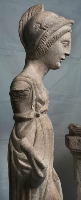 - rechter Arm, linker Unterarm abgebr., gr. Teil des Schildes, linkes Drittel der Plinthe, Oberkörper tlw. ergänzt