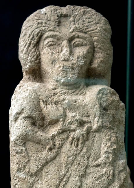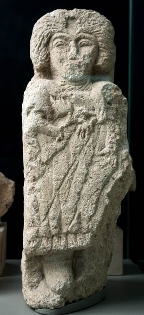- frontal stehende Frau mit Torques (?), in Mantel und Untergewand, in der Rechten Zweige (?). Göttin (?)