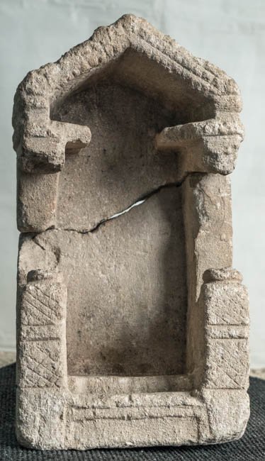 - Aedicula mit Satteldach, kurzen Seitenwangen und vorgestellten Säulen auf hohen kubischen Sockeln. Im Inneren auf dem Boden Stufe für Aufstellung einer Statuette.