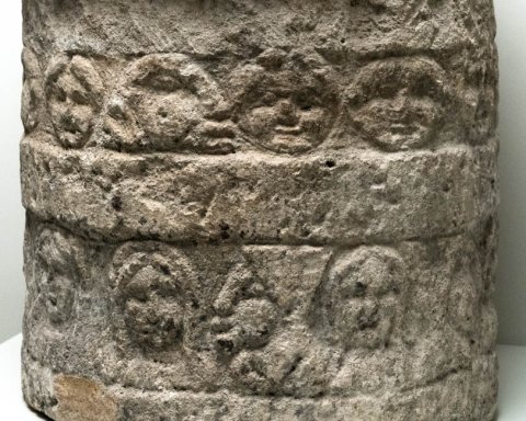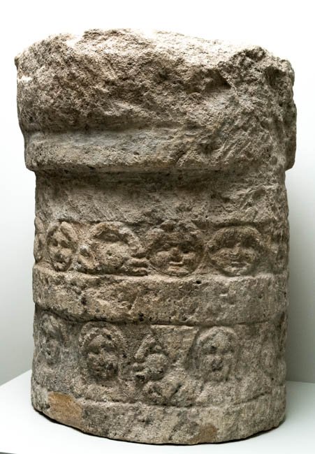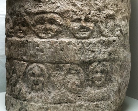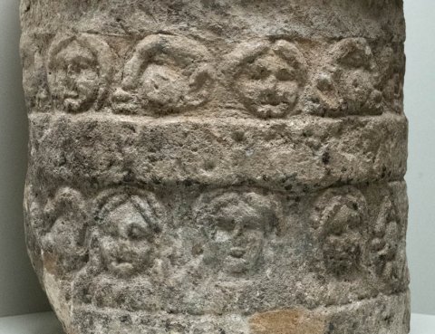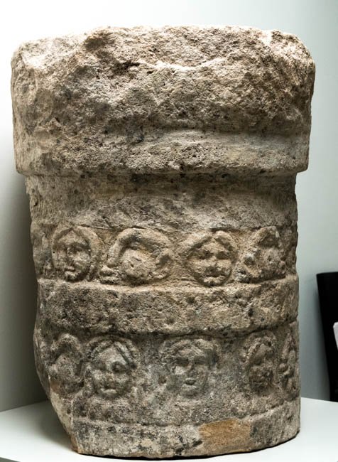 - Um den Säulenschaft abwechselnd glatte Bänder und Friese mit Köpfen en face und im Profil. (Vom selben Fundort bei Espérandieu zwei weitere Säulenfragmente mit Kopfreihen abgebildet).