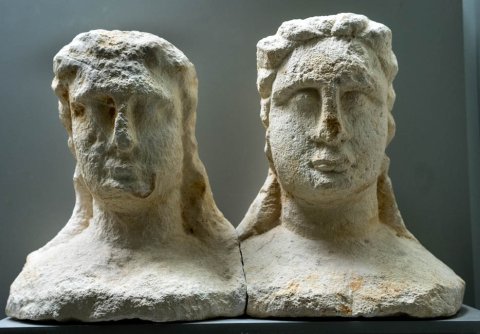 - aus einem Stück gearbeitete Votivbüsten von zwei Frauen mit langem Haar