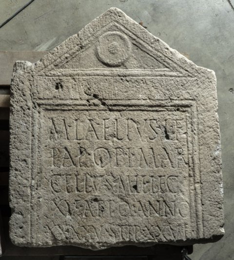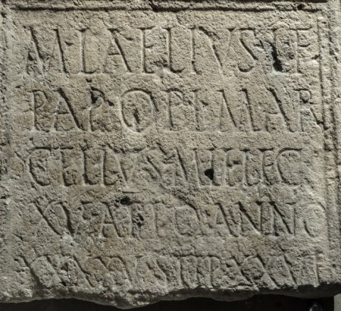 - M(arcus) Laelius L(uci) f(ilius) / Pap(iria) Opi(tergio) Mar/cellus mil(es) leg(ionis) / XV Apo(llinaris) anno(rum) / XXXXV stip(endiorum) XXVI / [---