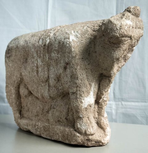 - stehender Stier mit Binde um den Leib; auf dem Kopf Ansatz eines mittleren Horns (?)