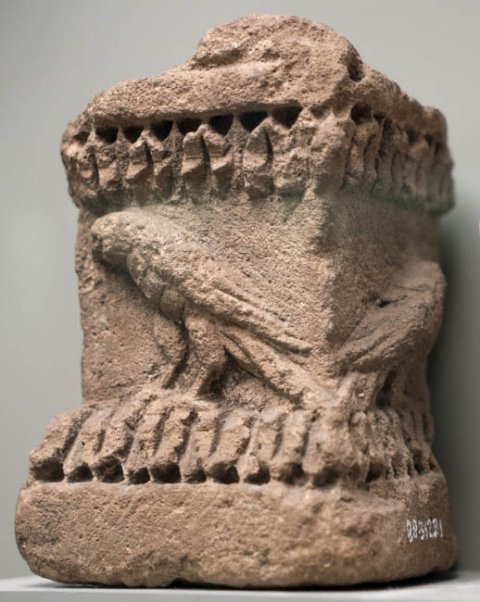 - Auf drei Seiten des Schaftes je ein stehender Rabe. Oben und unten Kymation.