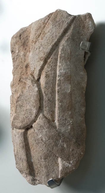 - Rest eines bekleideten Oberkörpers (?) mit runder Scheibe auf gekreuzten Bändern