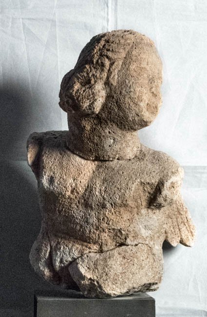 - Torso mit Kopf und Armansätzen erhalten, aus Fragmenten zusammengesetzt, verwittert