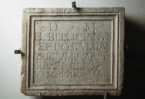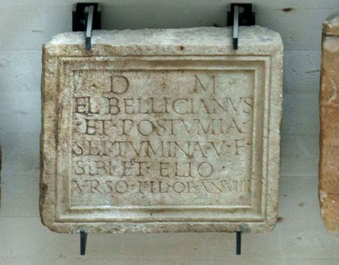 - D(is) M(anibus) / (A)el(ius) Bellicianus / et Postumia / Septumina v(ivi) f(ecerunt) / sibi et (A)elio / Urso fil(io) ob(ito) an(norum) VIIII