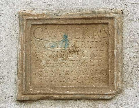 - Q(uintus) Valerius / Val(erii) lib(ertus) Crispus / v(ivus) f(ecit) sib(i) et Cat/tae matri et / Fusc(a)e uxor(i) / et Prim(a)e Crispi f(iliae)