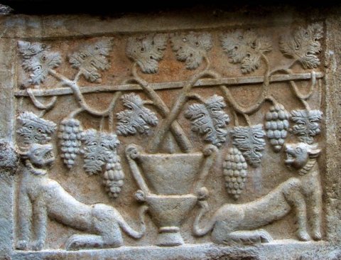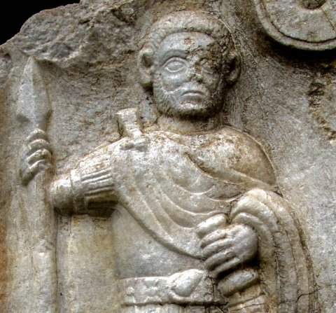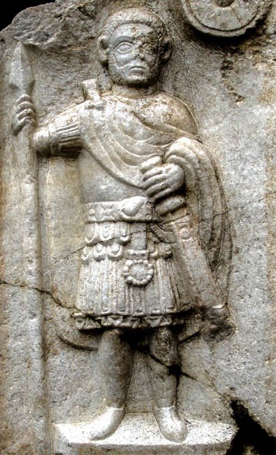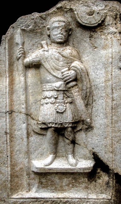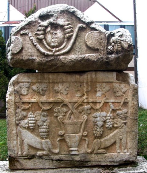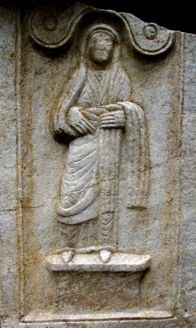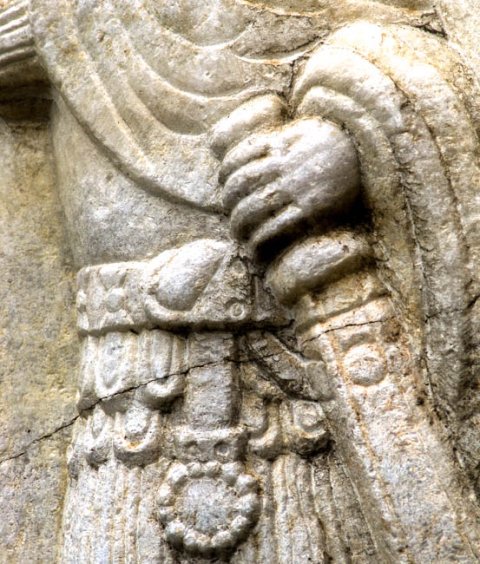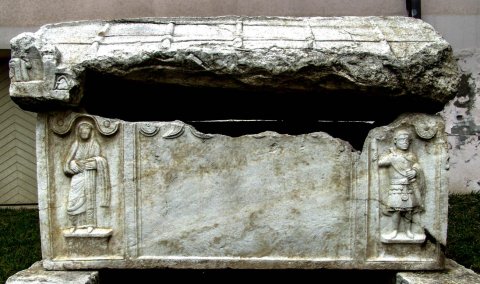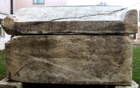 - Dachförmiger Deckel mit Eckakroteren, darin Personifikationen der Jahreszeiten. Zwischen den Akroteren der Vorderseite Efeuranke. Auf den Giebelflächen Gorgoneion. Auf der Vorderseite des Kastens leeres Schriftfeld, oben Rahmen mit sogen. Barockmotiv. In den Seitenfeldern Ehepaar auf Podesten. Links Frau mit über den Kopf gezogenem Mantel, rechts bärtiger Mann (Offizier) im Mantel mit Zwiebelknopffibel, Gürtel mit Beschlägen, Schuhen. Waffen: Panzer, Schwert, Lanze. Auf den Nebenseiten Krater mit Weinreben zwischen hockenden Panthern.