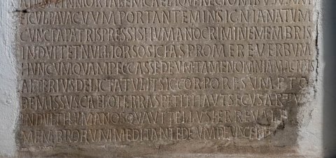 - Tartareis ruptus fornacibus implicat omnem / perpetuum vitae quondam datum nunc rapit acris / aeternum poenis factum pro crimine flamma / hic simili natos meritis pro talibus igni / ante obitum genuit perituros tabe parentum / donec cura deum miserandi cepit et atro / nunc tulit exitio simulacrum pendere semper / poenas indigne suum et premi nocte maligna / nam dominum puro velamine semper amictum / adque inmortalem caelique regionibus usum / et culpa vacuum portantem insignia natum / cuncta patris pressis humano crimine membris / induit et nulli orso sic fas promere verbum / hunc umquam peccasse deum tamen omnia magnus / alterius delicta tulit sic corpore sumpto / demissus caelo terras petit haut secus artus / induit humanos qua ut tellus ferre valebit / membrorum meditante deum de viscere / [---