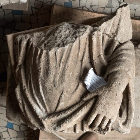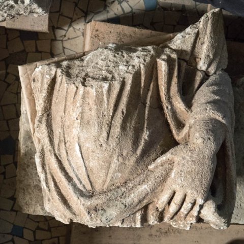 - unterer Teil des Torsos und linker Unterarm mit Hand, bekleidet mit Tunica und Mantel