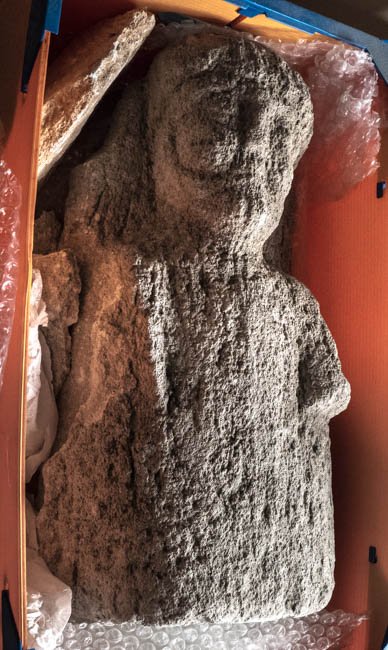 - stark verwittert, unten abgeschnitten, rechte Schulter u. Arme abgebr.