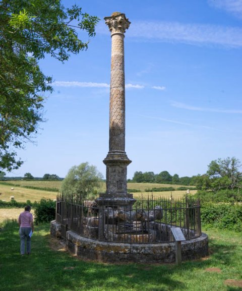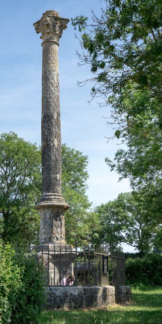 - Vierseitiger Sockel mit einwärts geschwungenen Seiten, darüber Gesims und achtseitiger Sockel mit Reliefs. Auf dem Säulenschaft unten Rautengitter mit Akanthusornamenten, oben Blattschuppen.