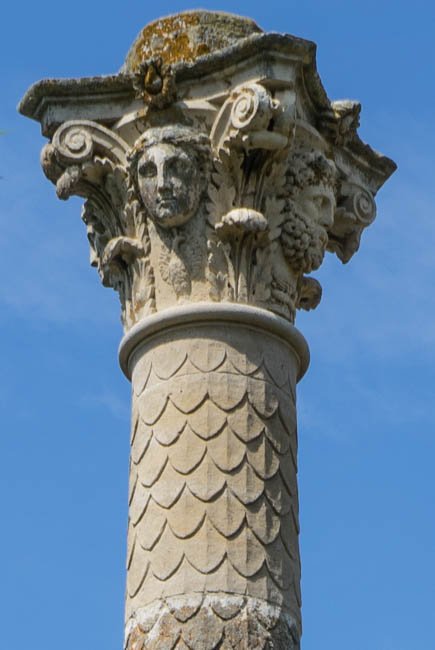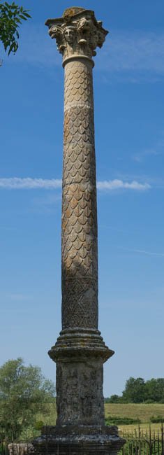 - stark verwittert, oberer Teil mit Kapitell ergänzt