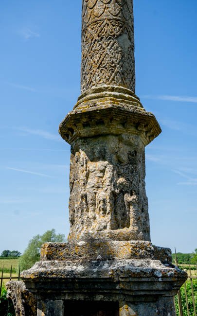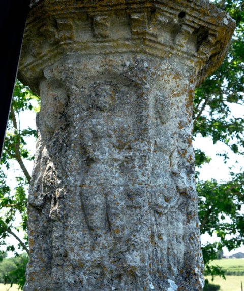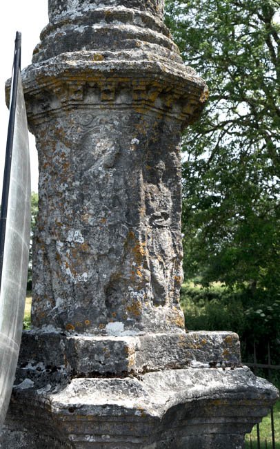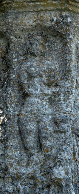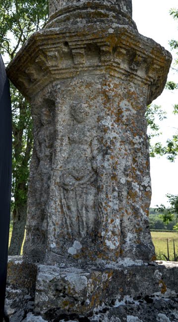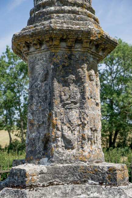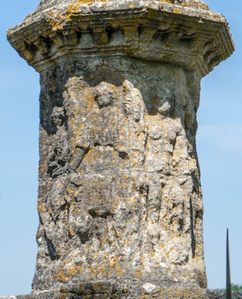- Oktogonaler Zwischensockel einer Jupitersäule mit Götterreliefs. Mythische Figuren, von links nach rechts: Juno mit Pfau, Jupiter oder Neptun, Mercur ?, Apollo mit Kithara und Greif ?, Venus, Hercules ?, Vulcan ?, Göttin. Basis mit eingezogenen Seiten, oben Konsolgesims.