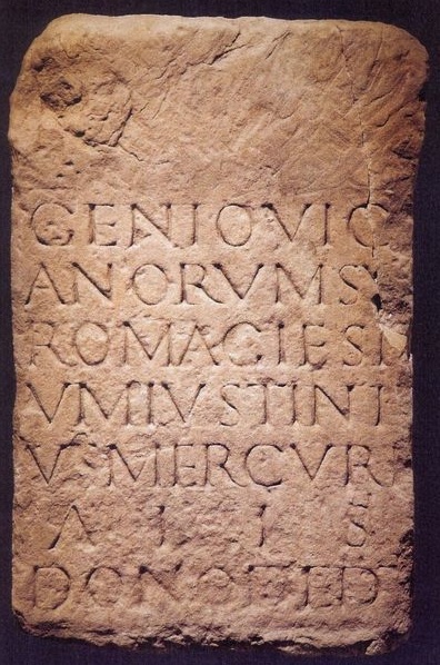 - Genio vic/anorum Su/romagie(n)si/um Iustini/us Mercuri/alis / dono dedit
