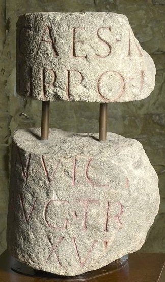 - [I]mp(eratori) Caes(ari) M(arco) [Iul(io)] / [P]hilippo P[io Fel(ici)] / [Invicto Aug(usto) et] / [Imp(eratori) Caes(ari) M(arco) Iul(io)] / [Phi]l[ippo Pio] / [F]el(ici) Invic[to Aug(usto)] / ab Aug(usta) Tr[ev(erorum) leug(as)] / XVI[III]