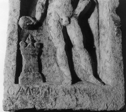 - Mythische Figur: stehender nackter Genius mit Kranz, Mantelbausch auf der linken Schulter, Füllhorn im linken Arm, opfert mit Schale über einem Altar mit Flamme. Inschrift auf dem oberen und unteren Rahmen.