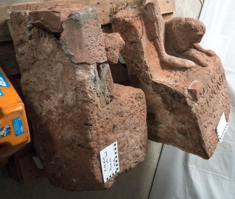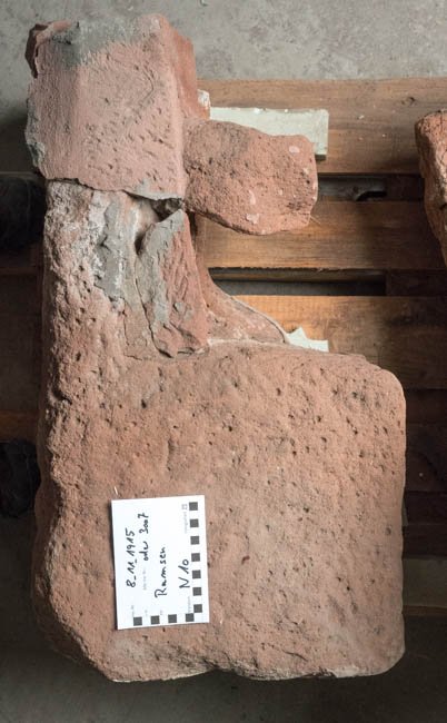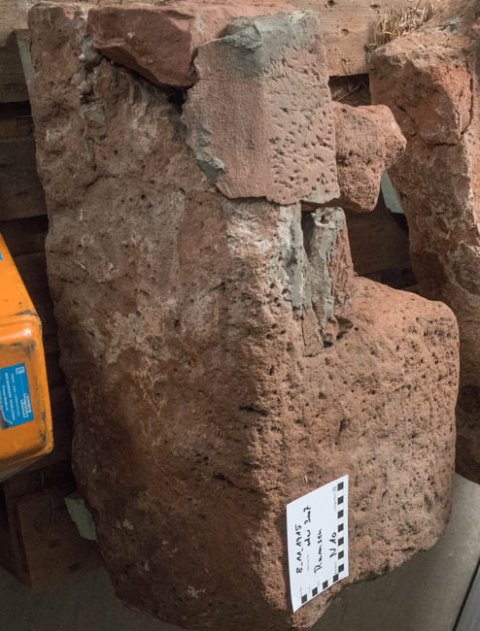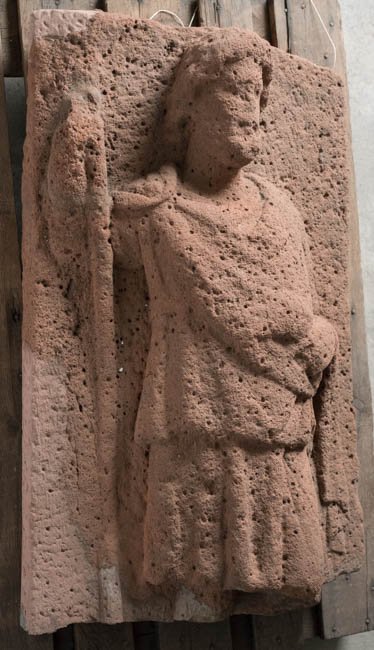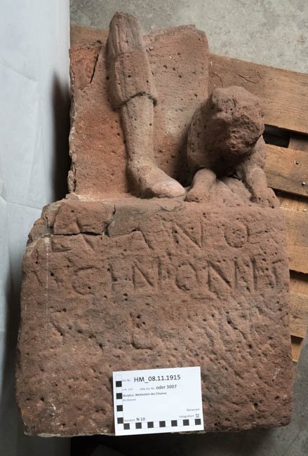 - Mythische Figur: stehender Silvanus in kurzer Tunica und Mantel, in der Rechten Stab, in der Linken Winzermesser (?). Zu beiden Seiten je ein liegendes Tier (Hund). Auf dem Sockel Inschrift.