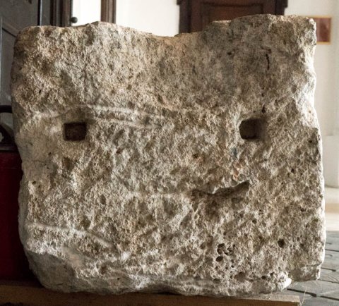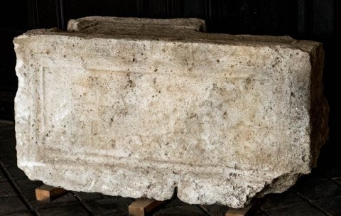 - oben verbr., in der Oberseite Dübellöcher, rechts unten abgebr.
