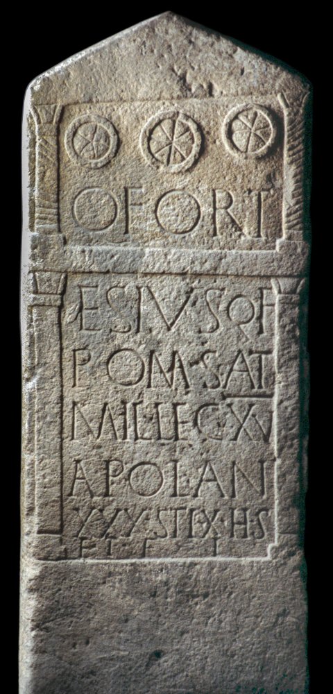 - Q(uintus) Fort//esius Q(uinti) f(ilius) / Pom(ptina) Sat(urninus?) / mil(es) leg(ionis) XV / Apol(linaris) an(norum) / XXX sti(pendiorum) X h(ic) s(itus) / e(st) t(estamento) f(ieri) i(ussit)