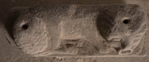 - auf Platte mit profiliertem Rand liegende Löwen, zwischen ihnen Pinienzapfen