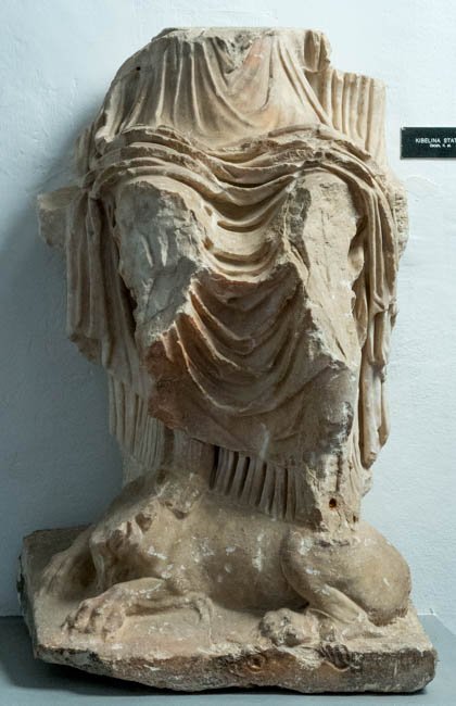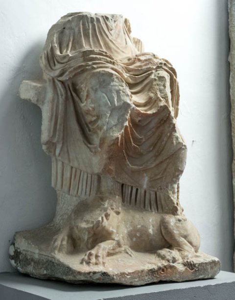 - Mythische Figur: thronende Kybele in Chiton und Mantel, Füße auf einem liegenden Löwen.