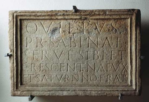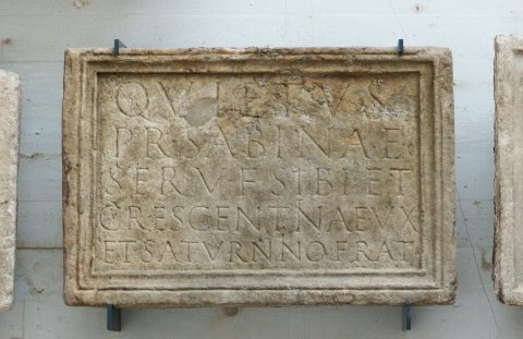 - Quietus / Pr() Sabinae / ser(vus) v(ivus) f(ecit) sibi et / Crescentinae ux(ori) / et Saturnino frat(ri)