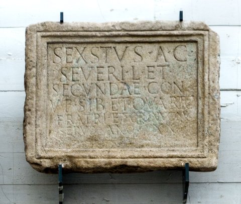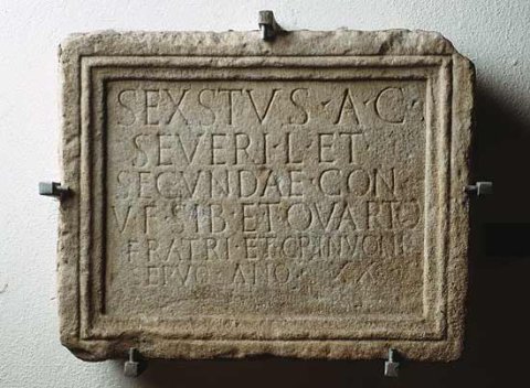 - Sexstus A(uli) C() / Severi l(ibertus) et / Secundae con(iugi) / v(ivus) f(ecit) sib(i) et Quarto / fratri et Crinuoni / servo an(n)o(rum) XX