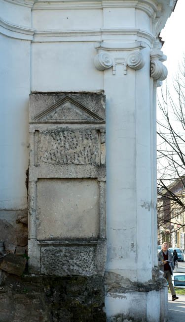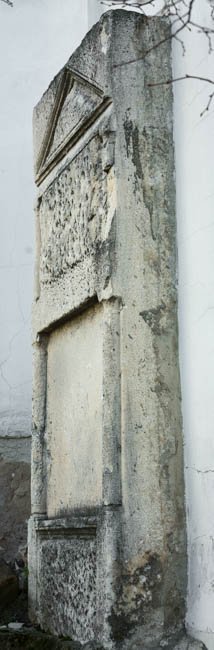 - unten abgebr., verwittert, Giebelfeld und Relieffelder bossiert, Schriftfeld geglättet