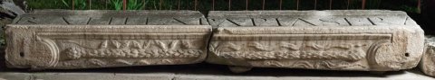 - Auf der Unterseite Soffitte mit Lorbeerstäben und Tänien.