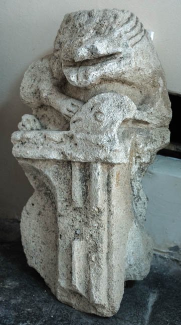 - Rechte obere Ecke einer Stele mit Bekrönung aus liegenden Löwen mit Widderkopf in den Pranken. Rest einer Bogennische, flankiert von kannelierten Pilastern;