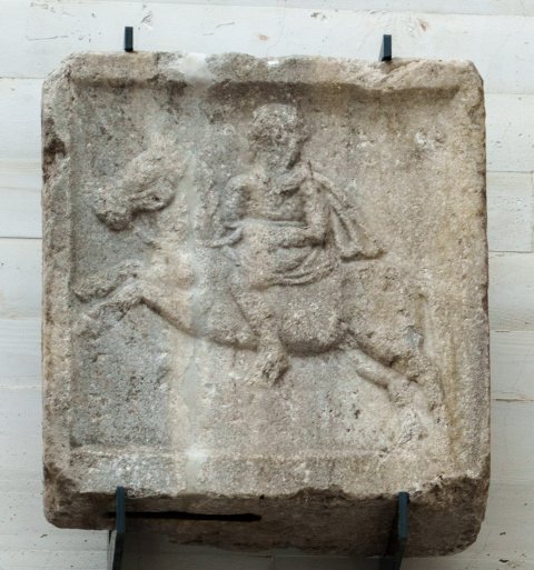 - In Rechteckfeld galoppierender Reiter in kurzer Tunica und Sagum.