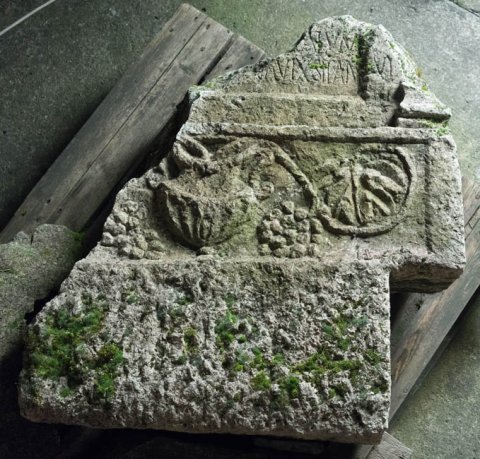 - Sockelbild: Krater mit Weinranken. Schriftfeld zwischen Pilastern.
