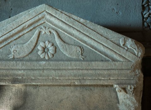 - Giebel mit profiliertem Rahmen, im Giebelfeld Rosette zwischen Delphinen, über den Giebelecken je eine Maus (?). Leeres, geglättetes Feld zwischen Säulen mit Lorbeerblattschuppen;