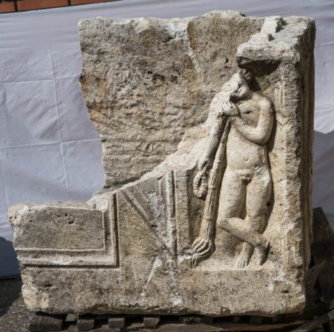 - tabula ansata (ohne Inschrift ?) zwischen Seitenfeldern mit Trauergenius mit Fackel und Kranz;