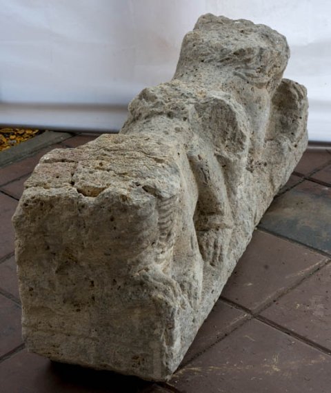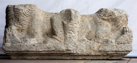 - auf Gesimsplatte liegende Löwen mit Widderkopf in den Pranken;