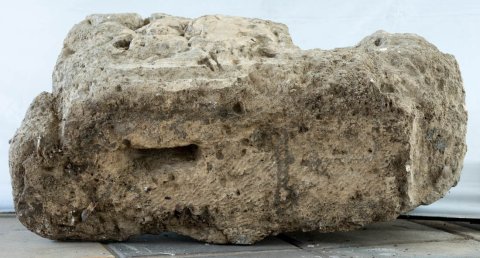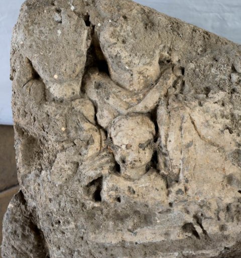 - seitlich u. oben abgebr., unten ?, stark bestoßen, auf der Unterseite Klammerloch