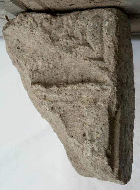 - eingeschriebener Giebel, Giebelfeld leer, auf der Giebelschräge Reliefspuren, unten profiliertes Gebälk auf Pilastern;