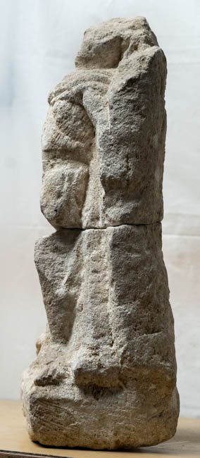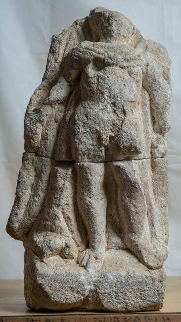 - stark bestoßen, horizontaler Bruch durch die Oberschenkel, Kopf oben abgebr., in der Bruchfläche rundes Dübelloch
