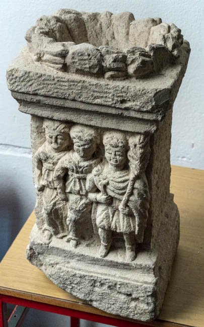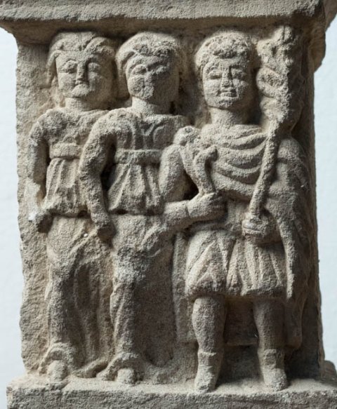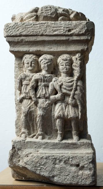 - Auf der Vorderseite des Altarschaftes drei stehende mythische Figuren: rechts Silvanus in kurzer Tunica, Mantel und Schuhen, in der Rechten Winzermesser, in der Linken Zweig. Links hinter ihm zwei Silvanae im gegürteten langen Gewand. Auf der Deckplatte runde Ausnehmung, eingefasst von Kranz mit Clipeus.