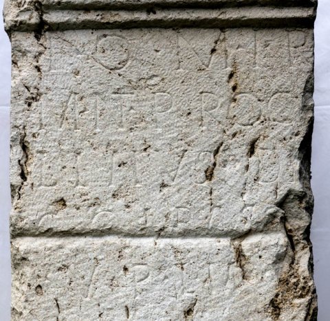 - verwittert, Kanten verbr., in der Inschriftseite horizontale Kerbe