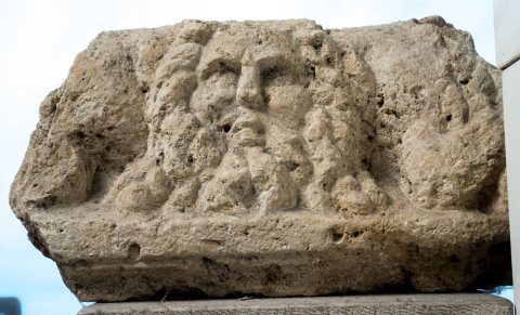 - Bärtiger Kopf zwischen liegenden Löwen auf Platte mit profiliertem Rand;
