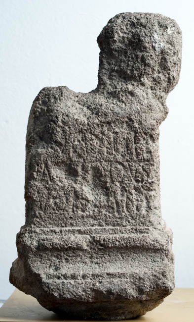 - oben abgebr., unten verbr., stark verwittert, Sockel verjüngt sich nach unten zu