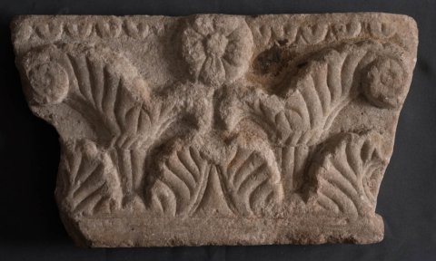 - Lisenenkapitell mit Akanthusblättern und Rosette, am oberen Rand Kyma