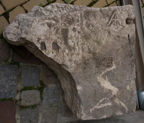 - Am rechten Rand Werkzeug (Lot), weiter links Rest eines Relieffeldes.