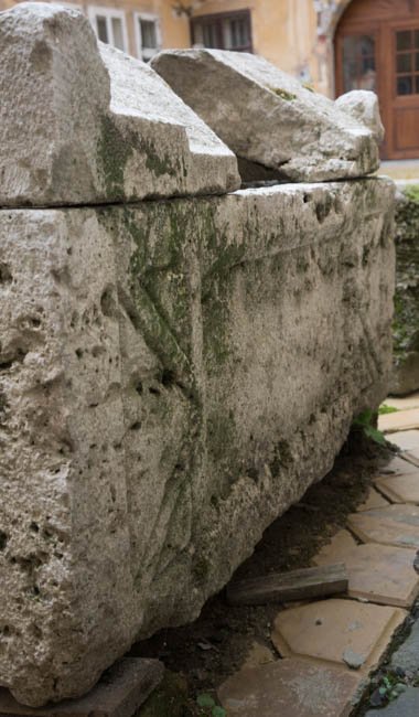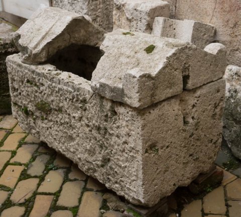 - Sarkophag mit dachförmigem Deckel mit Akroteren, auf dem Kasten tabula ansata