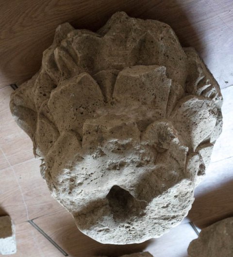- Kapitell mit einfachen Blattkränzen, oben Ansätze von Voluten (?);