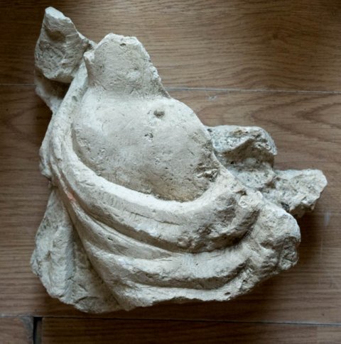 - Mythische Figur: nackter Unterkörper einer stehenden Figur mit um Hüften und Beine geschlungenem Mantel;