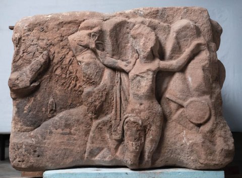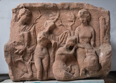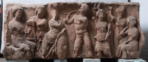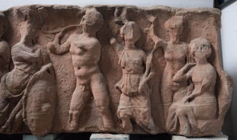 - Mythos, Musikinstrument: auf der Längsseite Wettstreit von Apollo und Marsyas (links sitzender Apollo mit Kithara, stehende männliche Figur, Athena-Minerva mit Helm und Schild, Marsyas mit Flöte (Aulos), Artemis-Diana, stehende und sitzende Nymphe). Auf der rechten Schmalseite Aktaion und Artemis beim Bad zwischen zwei Nymphen (an diese Szene schließt der Aktaion vom Block 26468 an), auf der linken Schmalseite an den Felsen gefesselte Hesione und Ketos (zu dieser Szene gehört der Hercules-Herakles mit Köcher vom Block 26468).